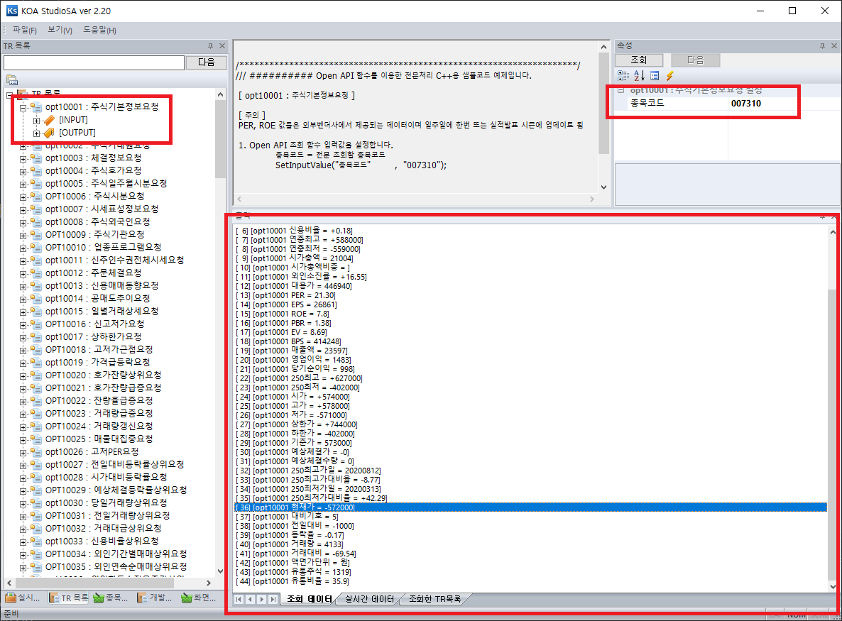 먼저, KOA Studio를 통해 주식기본정보요청(OPT10001)를 확인해 보자.