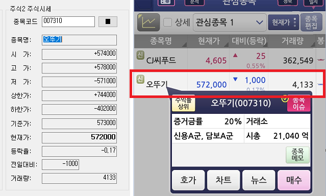 전일대비 1000원 하락인 경우 -572000으로 표시되며, CJ씨푸드의 경우 전일대비 +25원으로