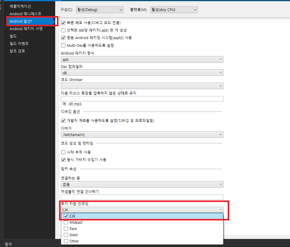 해결법은 Android build 옵션에서 Internationalization 항목에 'CJK' 추가 인코딩 옵션을 설정해야 하는데,