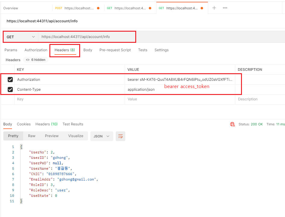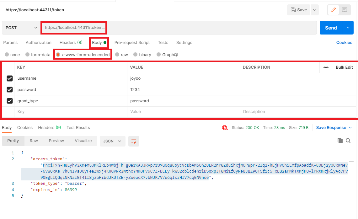 webapi로 작성된 인증서버의 postman을 통해 token 획득시 호출 예제