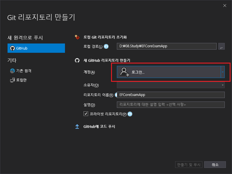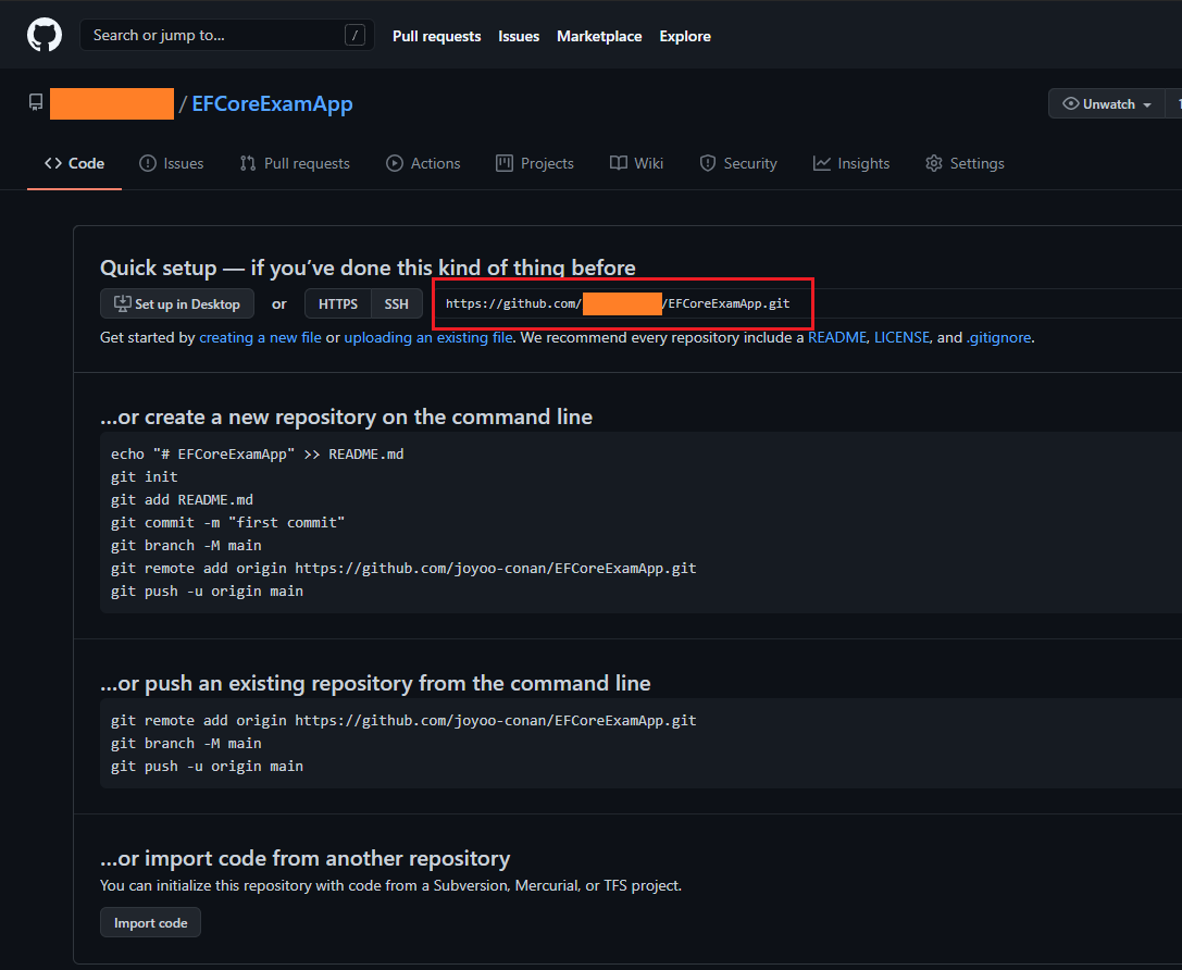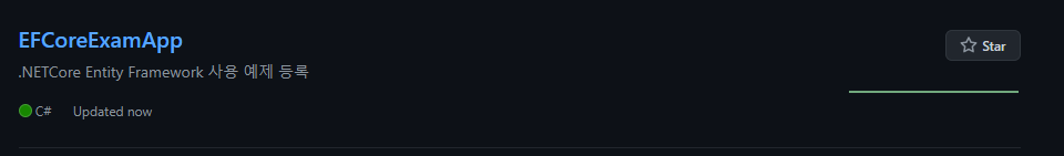 github에 EFCoreExamApp repository가 생성 되었으며, 이후부터 github를 통해 팀원들과 소스코드 관리가 가능해 진다.