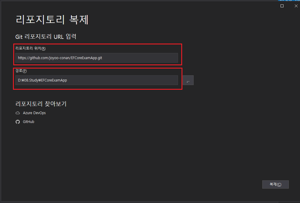 우선, github에서 EFCoreExamApp의 Repository URL을 넘겨받아 visualstudio 레포지토리 복제시 아래 화면에 붙여넣기 하고, 경로를 지정, 복제 한다.