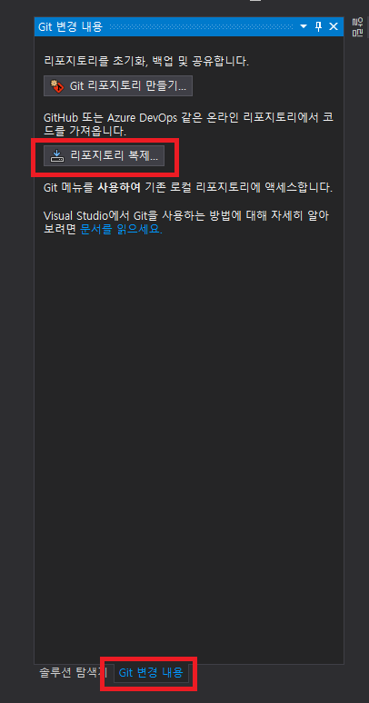 우측하단의 'Git 변경 내용' 메뉴를 선택 Github Extension 메뉴의 Git 레포지토리 복제를 통해 Clone를 생성한다.