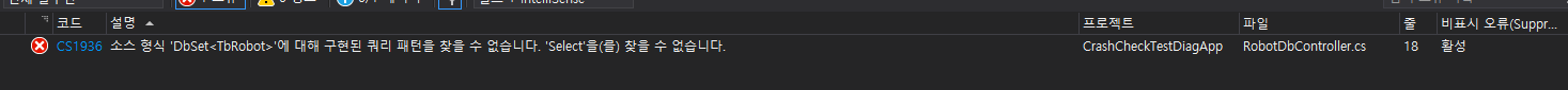 소스 형식 DbSet<Table>에 구현된 쿼리 패턴을 찾을 수 없습니다.' 'Select'을(를) 찾을 수 없습니다.