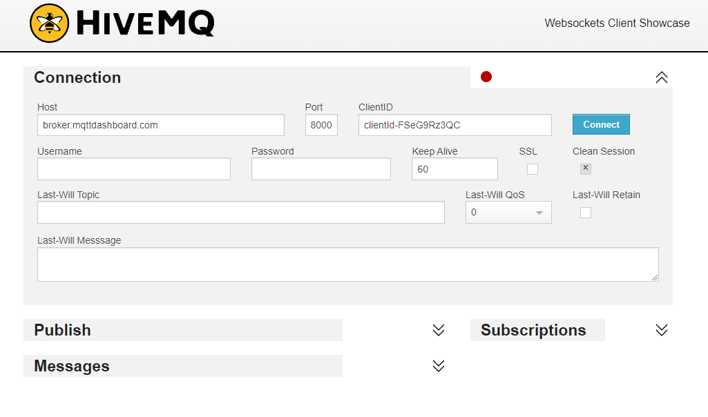 hivemq에서 획득한 broker정보를 아래 client page에 입력 후 'Connect'