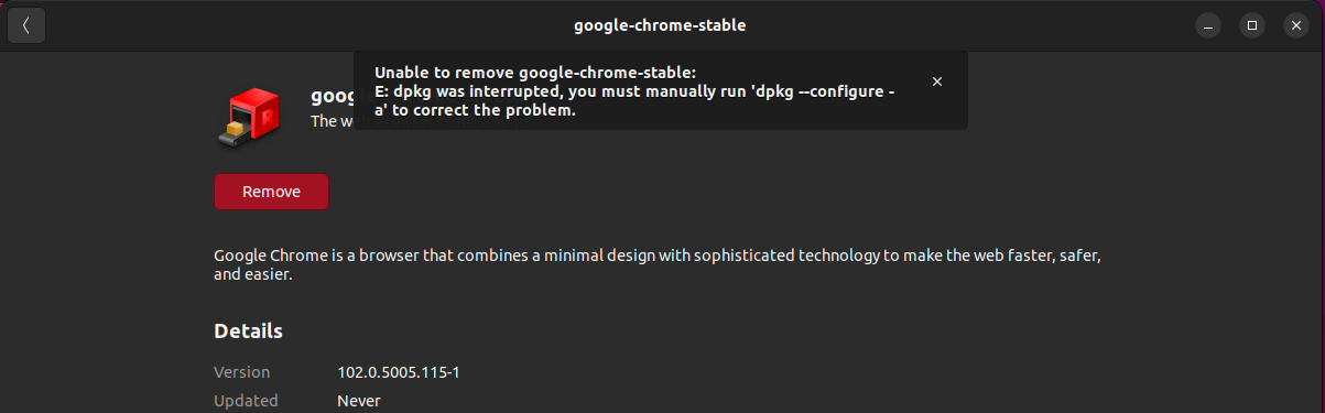 reinstall을 위해 brower를 통해 dep 파일을 다운로드, 설치를 위해 이전 version 삭제를 시도했으나 dpkg was interrupted 이슈가 발생 한다.