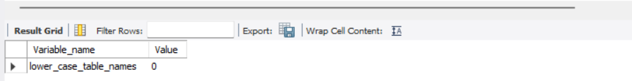 원인을 확인해보니 MySQL에서 테이블 대소문자를 구분하도록 되어 있어서 발생한 현상으로 아래 Query로 설정 정보를 확인할 수 있다.