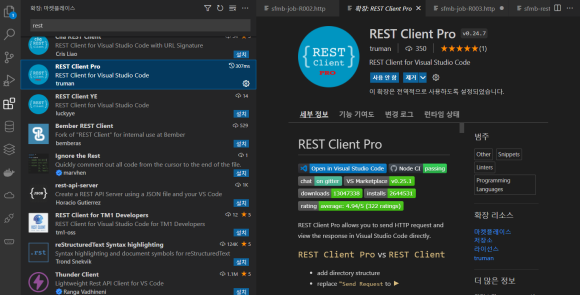 VSCode에서 rest client 플러그인을 검색 설치 한다.