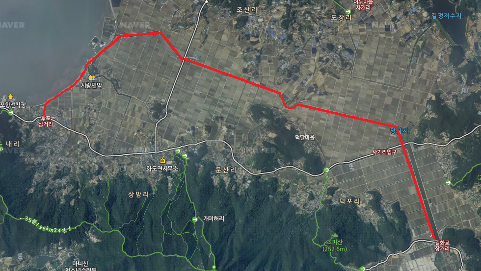 네이버 지도의 경로로 이동하면 제일 좋지만 빨간색 라인의 코스는 큰차도 많이 다녀 너무 위험해서 한운 산업단지를 통해 초지대교 까지 이동 한다.