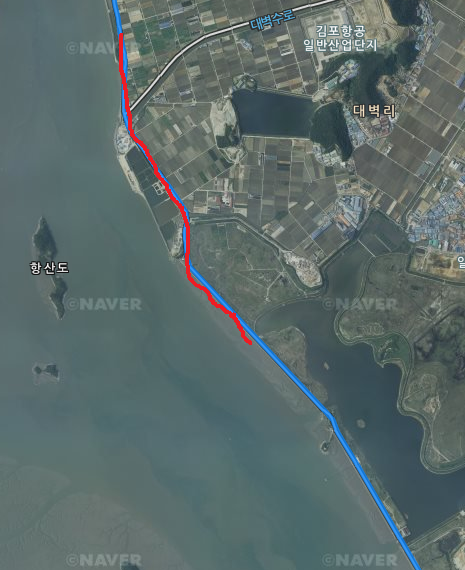네이버 지도의 경로로 이동하면 제일 좋지만 빨간색 라인의 코스는 큰차도 많이 다녀 너무 위험해서 한운 산업단지를 통해 초지대교 까지 이동 한다.