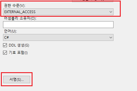 생성할 CLR DLL Library는 안전여부를 떠나 Win32 등을 이용할 것이므로 UNSAFE 권한 수준으로 적용할 것이며, 프로젝트 -> SQLBaseFunctions 속성 -> SQLCLR 탭에서 권한수준을 'UNSAFE'로 선택하여 빌드한다. 또는 외부접근을 허용할 경우 EXTERNAL_ACCESS 옵션을 적용하여 외부접근을 허용할 수 있도록 한다.