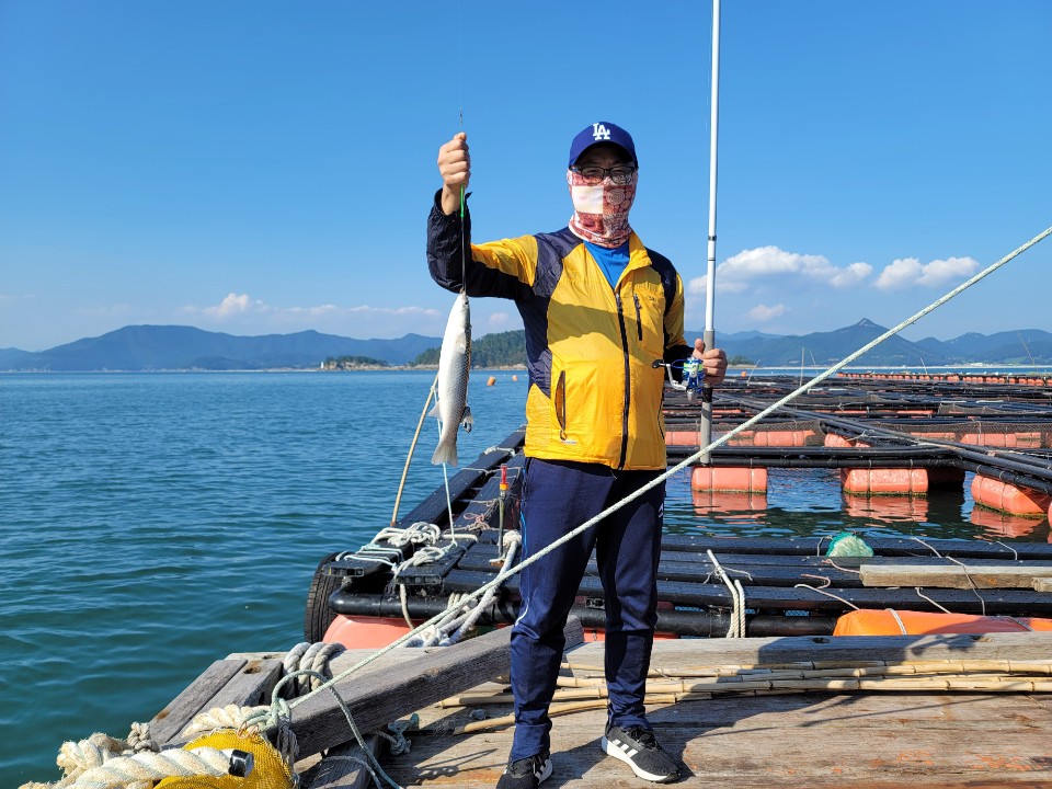 풍화리 함박항에서 친구아버지 배타고 인근 가두리 양식장에 내려 낚시로 그동안 도시생활의 고단함을 달랜다.