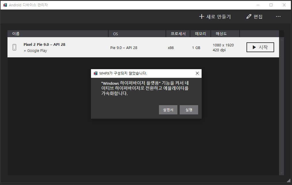 에뮬레이터는 기본 Pie 9.0을 선택, 시작시 하이퍼바이저가 설치되지 않는 경우 아래 Popup이 표시된다.