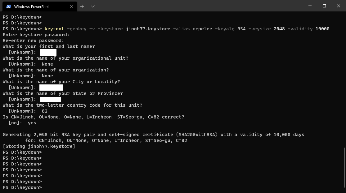 >keytool -genkey -v -keystore xxxxx.keystore -alias mcpelee -keyalg RSA -keysize 2048 -validity 10000