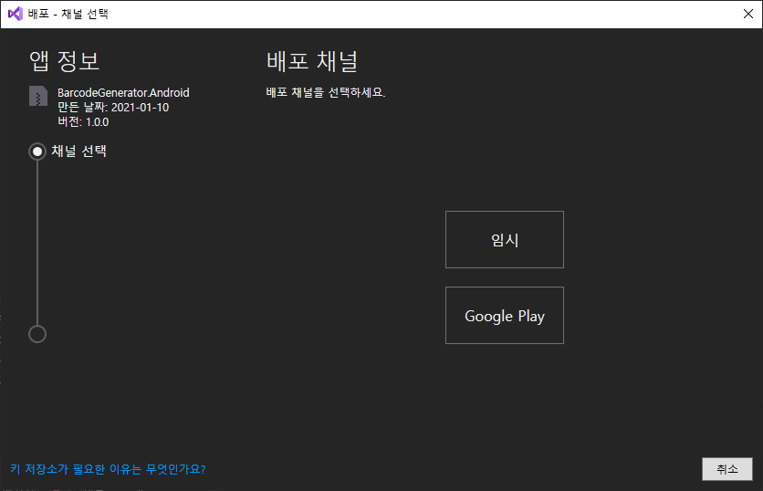 첫번째 배포 채널을 선택하게 되는데 우선 '임시'를 선택 한다.