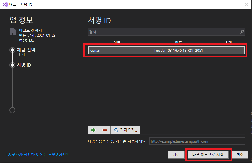 Key가 생성되었으면 생성된 Key를 선택, '다른 이름으로 저장' 버튼을 누르면 서명키가 적용된 apk를 생성한다.