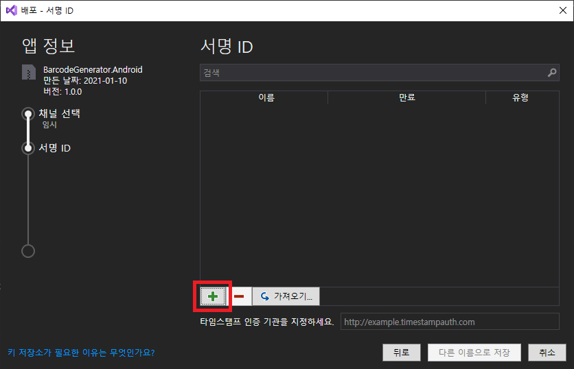 keytool을 이용하여 key를 생성하지만 VisualStudio에서는 별도 기능을 제공 한다.(*jdk 설치는 필요 없는듯)