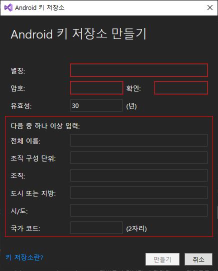 위 그램과 같이 Android 키 저장소 생성 한다. (AndroidStudio도 위 그림과 같은 기능을 제공함)