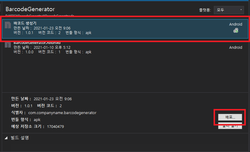 Build결과 apk가 만들어지고 우측 하단에 '배포' 버튼을 통해 본격적으로 배포 apk를 생성해 보자.
