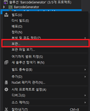 다음으로 apk를 생성하는 과정이다. 소스코드가 완성되면 아래 그림과 같이 project.Android 프로젝트를 선택, 마우스 우클릭 후 '보관' 메뉴를 선택 한다.