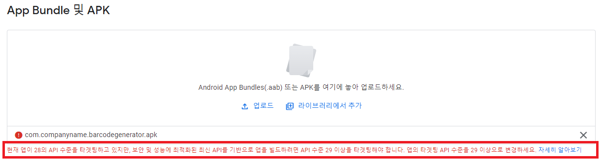 현재 앱이 28의 API 수준을 타겟팅하고 있지만, 보안 및 성능에 최적화된 최신 API를 기반으로 앱을 빌드하려면 API 수준 29 이상을 타겟팅해야 합니다. 앱의 타겟팅 수준을 29 이상으로 변경하세요.