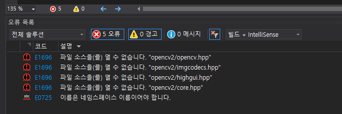 VisualStudio2019 환경에서 오랜만에 c++로 OpenCV 예제를 작성하는 중이다. 우선 opencv release를 다운로드, VisualStudio에서 개발환경에 맞게 설정하였지만 "opencv2/opencv.hpp"를 찾을 수 없다는 error가 발생한다.