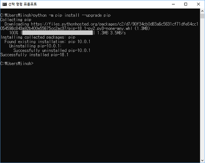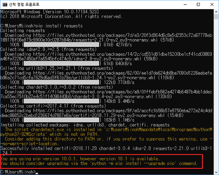 requests 설치 후 pip를 18.1로 upgrade 하란다. 그리고 pip 업그레이드 진행